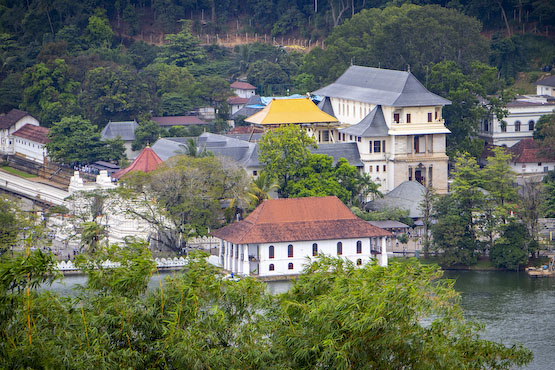 | Formerly a royal forest safeguarded by the Sri Lankan kings, the Udawattakele Forest Reserve can be seen as it spreads over the landscape beyond the Temple of the Tooth Relic. |